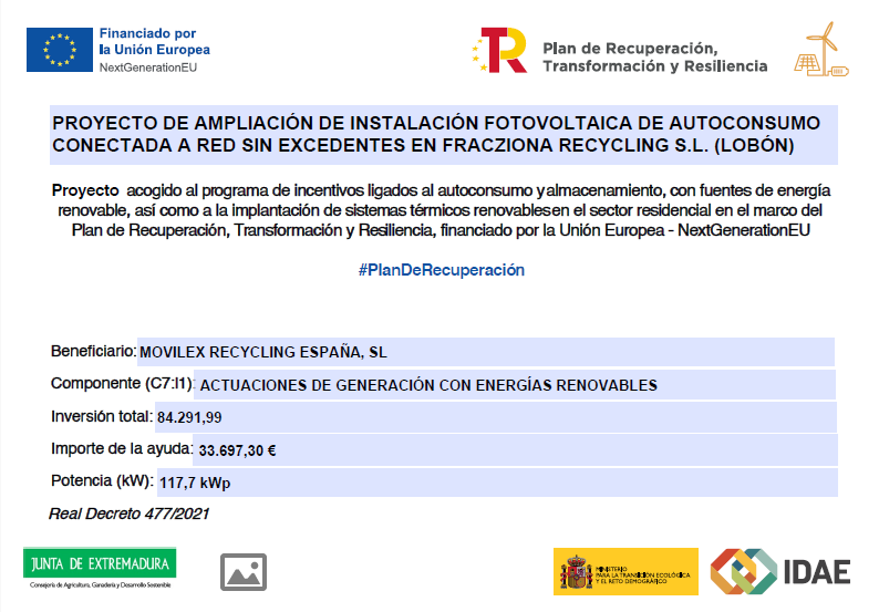 “Recientemente hemos instalado una planta fotovoltaica de autoconsumo con excedentes acogida a compensación, con una potencia de 117,70kWp. Realizada con una inversión total de 84.291,99€ y con una ayuda recibida de 33.697,30 €. Proyecto acogido al programa de incentivos ligados al autoconsumo y almacenamiento, con fuentes de energía renovable, así como a la implantación de sistemas térmicos renovables en el sector residencial en el marco del Plan de Recuperación, Transformación y Resiliencia, financiado por la Unión Europea – NextGeneration EU RD de la ayuda, el 477/2021